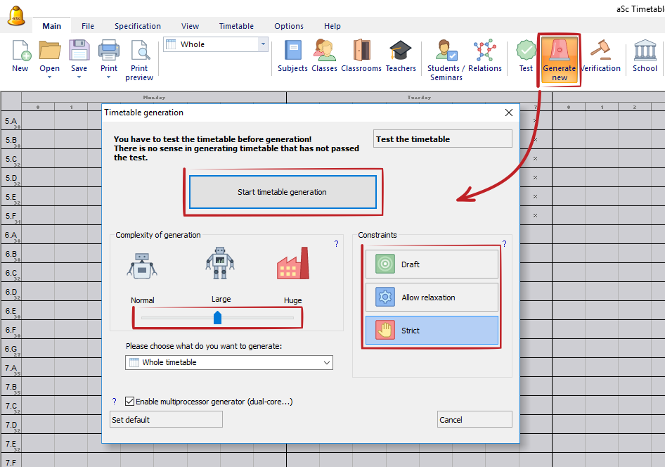 Si todavía no ha comprobado el horario o ha hecho grandes cambios en los datos introducidos, es bueno hacerlo antes de la generación. Sólo haga clic en el botón 'Comprobar el horario'.