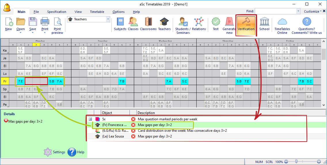 El programa aScHorarios le permite verificar el horario creado. Puede activar la verificación del menú Horarios/Verificación. Le muestra las condiciones rotas o relajadas en su horario corriente.