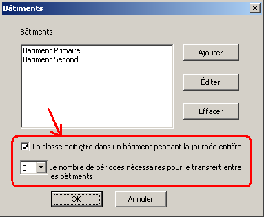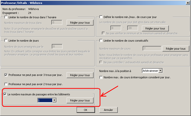 2) Combien de temps cela prend au transfert entre les bâtiments. Si vous entrez 1 ici, cela signifie que le professeur a besoin d´une période libre pour transférer entre les bâtiments. Si vous entrez 0, cela signifie que les bâtiments sont très proches et le professeur peut transférer pendant la récreation entre les cours.