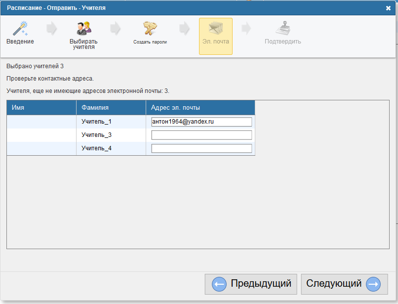 Программа может попросить Вас создать пароли для новых учителей. Это происходит, когда Вы отправляете расписание по емейлу новым учителям, которые были добавлены в расписание, но их еще нету в базе данных Интернета. Вы можете добавить их просто нажав кнопку "Добавить" рядом с их именем.