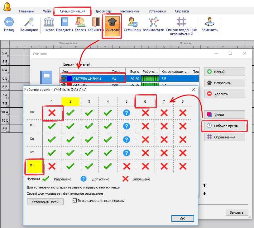 Изменить знак в таблице времени можно нажав мышкой на нужную позицию, или можно нажать на заголовки таблицы, чтобы изменить целый ряд или столбик сразу. Например, если учитель не может преподавать в пятницу, просто нажмите на название этого дня недели, и пятница будет обозначена как неприемлемый день.