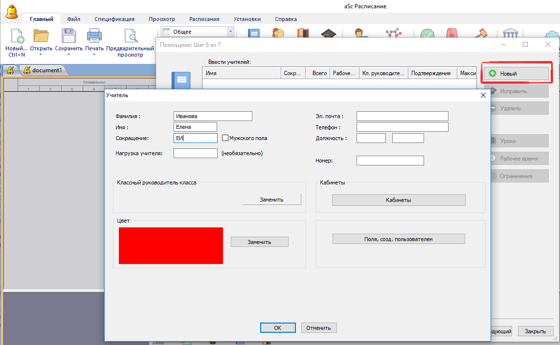 • Цвет и картинку: присвоить цвет и картинку учителю для отображения в расписаниях для печати