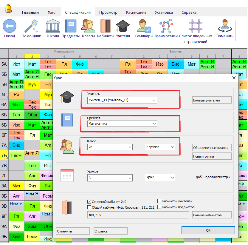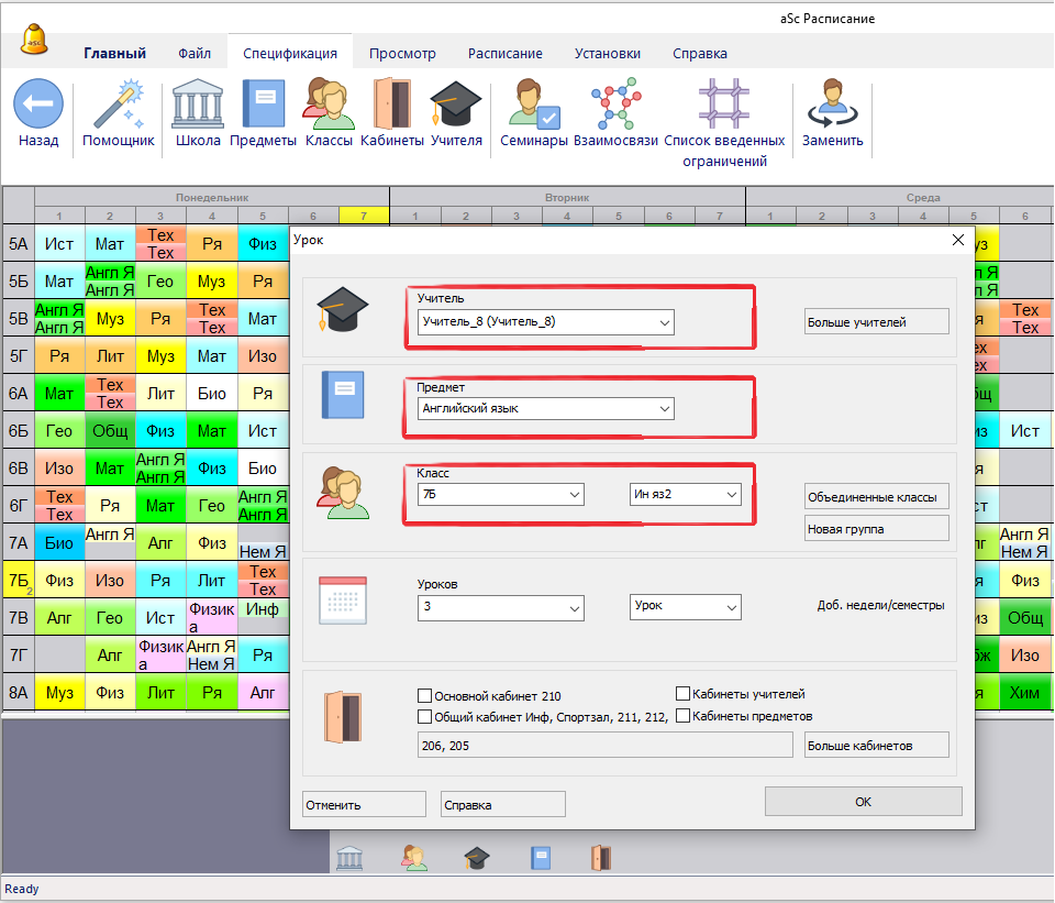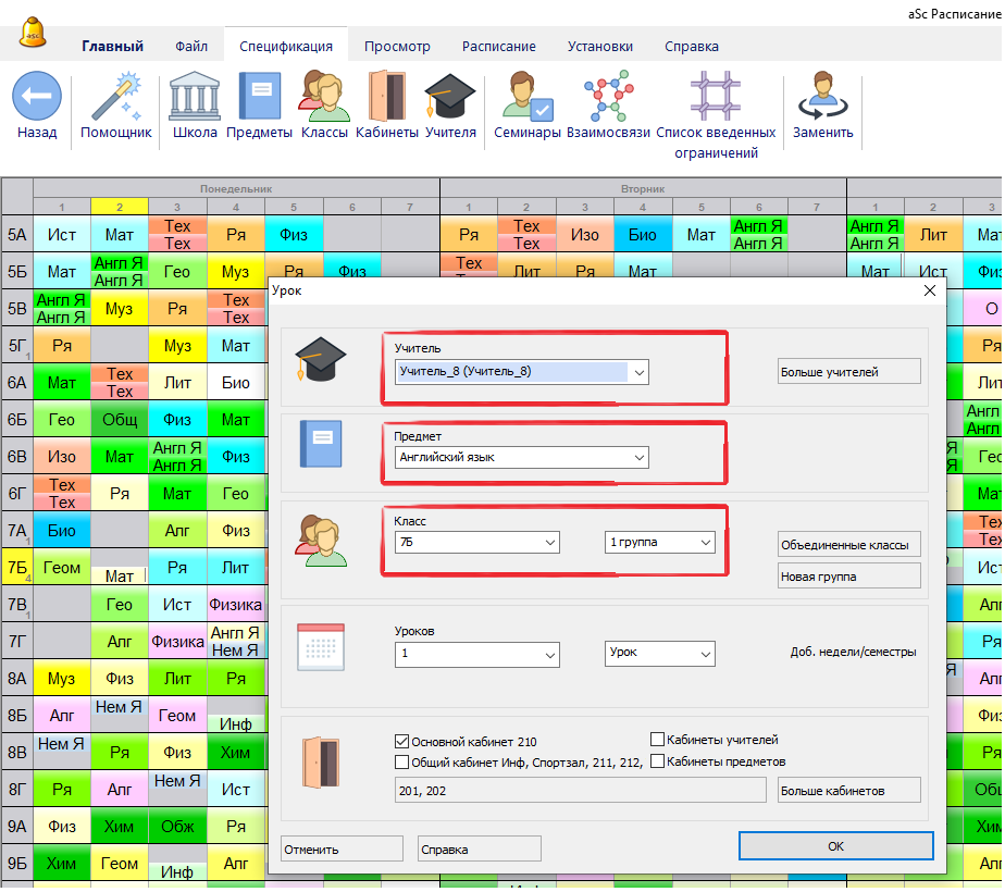 Например, можно указать что один учитель преподает Английский для одной группы:
