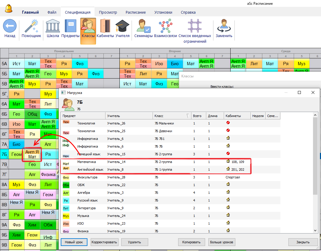 Случай, если предмет тот-же, но два учителя преподает английский для двух групп одного класса: