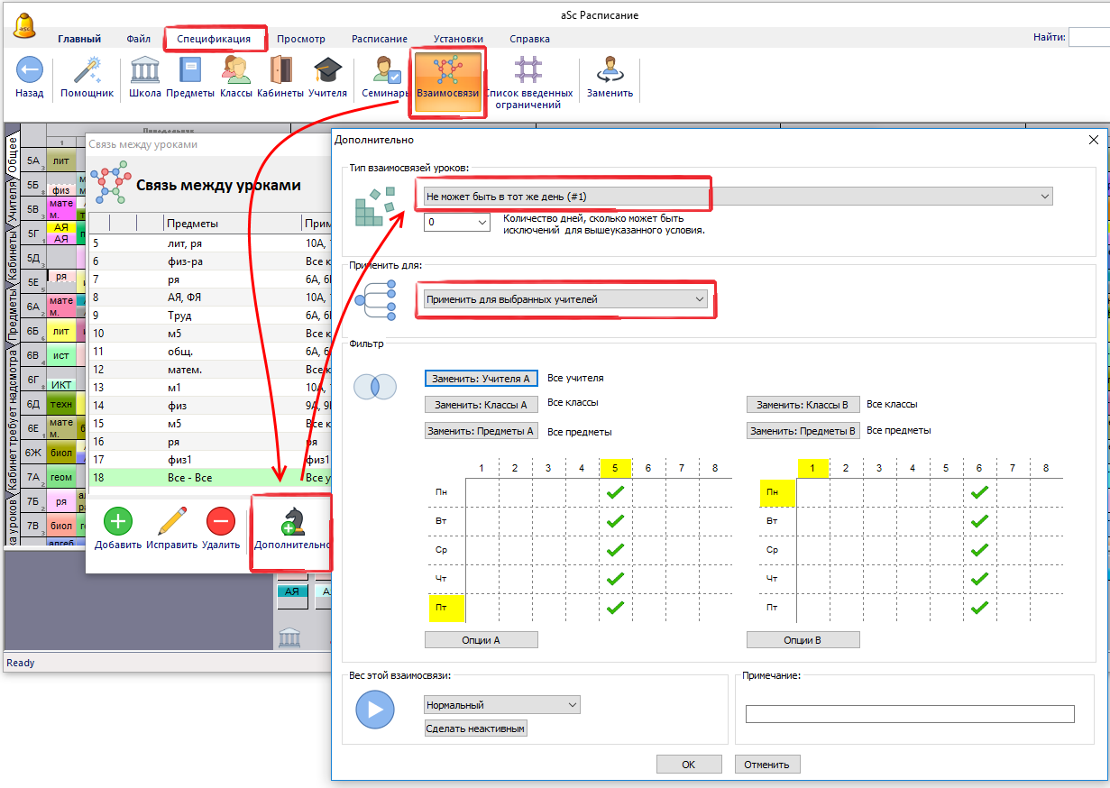 Выберите «Уроки не могут проходить в тот же самый день», «Применить для выбранных учителей», «Все учителя». В части А отметьте 5-ый урок, в В – 6-ой. Сейчас программа не сможет поставить уроки и в 5-ую, и в 6-ую позицию в тот же самый день для того-же учителя.
