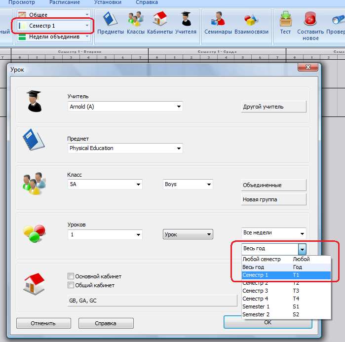 Можно определить и специальные семестры. Если указали что у вас есть 4 семестры, программа автоматически добавит еще два, Semester 1 и Semester 2. Semester 1 - это T1 И T2, и если вы для урока указали S1 то он будет проходить на обоих семестрах T1 и T2 в тот же день и то же время.