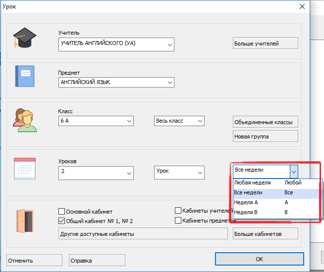 Затем для каждого урока можно указать, в которой неделе он может быть. По умолчанию указывается Все недели. Это означает, что урок будет на том же месте во всех неделях. Можете выбрать неделю А или B или Любую неделю.