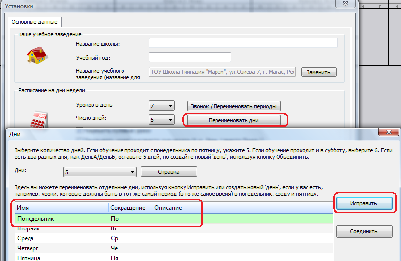 Если школа имеет 2 разные дня: День А и День B, и День А - это понедельник, среда и пятница, а День B - вторник и четверг. Тогда вы можете создать новые дни A и B. Просто используйте кнопку "Соединить":