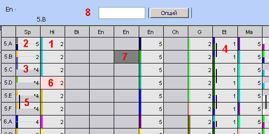 1) Если ячейка в сетке - светло-серая, это означает, что предмет (указан в оглавлений колонки) преподается в соответствующем классе. Число в ячейке показывает число периодов (уроков или академических часов)в неделю. Цветная полоса на левой стороне ячейки показывает цвет учителя.