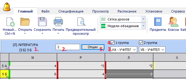 Основные выборы редактирования в сетке уроков есть на верхней панели: