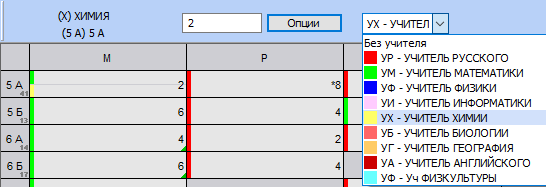 Нажав на это поле, откроется список учителей, и можете выбрать нужный. В этом списке Вы можете видеть общее количество уже назначенных уроков учителю. Строка уже выбранного учителя будет серого цвета.