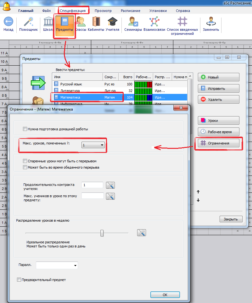 Для каждого предмета Вы можете определить, сколько раз в неделю он может быть в позициях, помеченных вопросительным знаком.