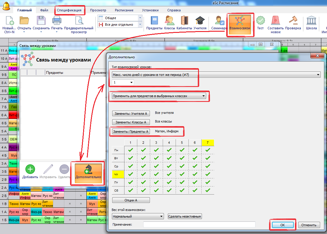 - в раскрывающемся списке взаимосвязей выберете "Максимальное число дней с уроками в тот же период".