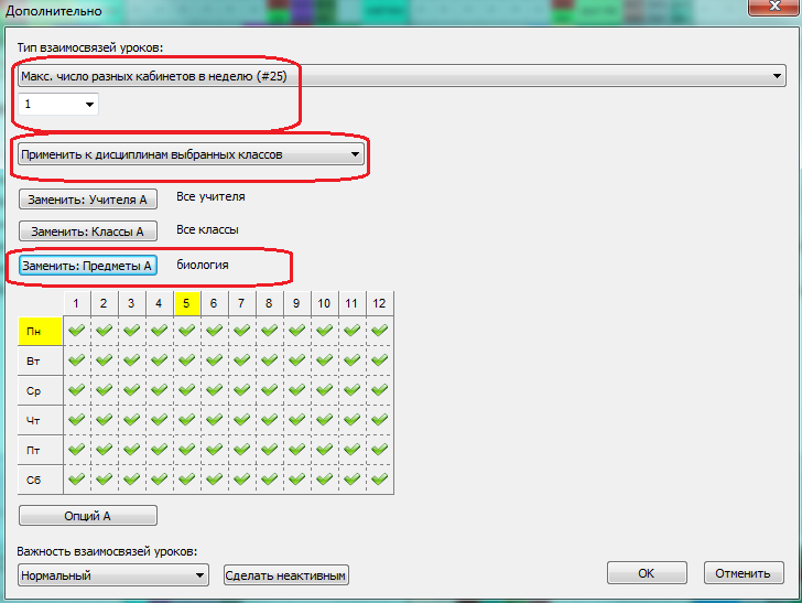 2. Добавим условие, которое гласит, что этот урок в любом классе может проходить не более чем в одном кабинете в неделю: