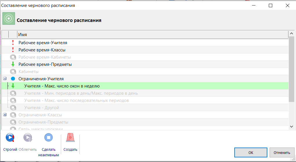 При составлении чернового расписание можно выбрать, какие ограничения оставить строгими, какие можно облегчить и какие игнорировать (сделать неактивными).