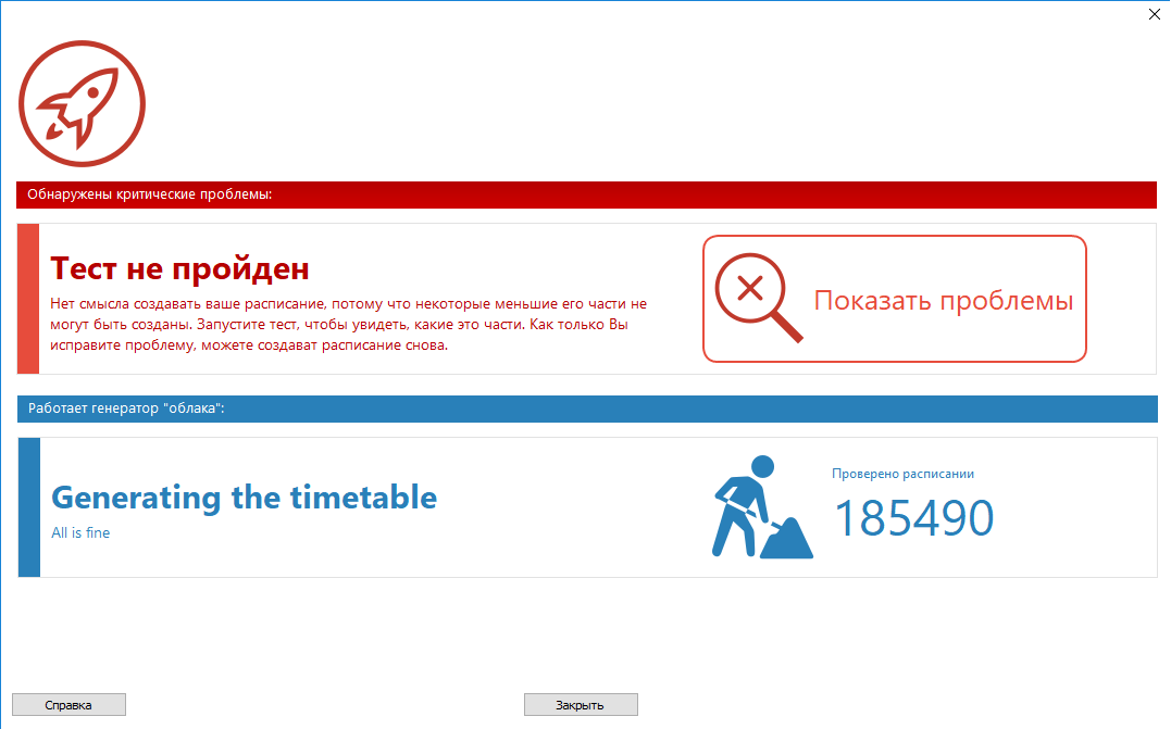 Облачный генератор остановится, как только найдет решение со всеми размещенными уроками и без ослабленных ограничений. Если вы закроете его, он предложит вам сохранить лучшие расписания, найденные во время генерации.