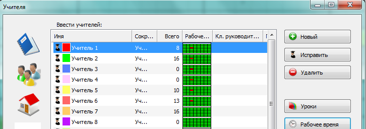 Теперь установим учителям их рабочее время. Все было прекрасно, пока мы не определили, что 6 учителей в среду не могут иметь уроки на 3 периоде (пометили этот урок красным крестиком).