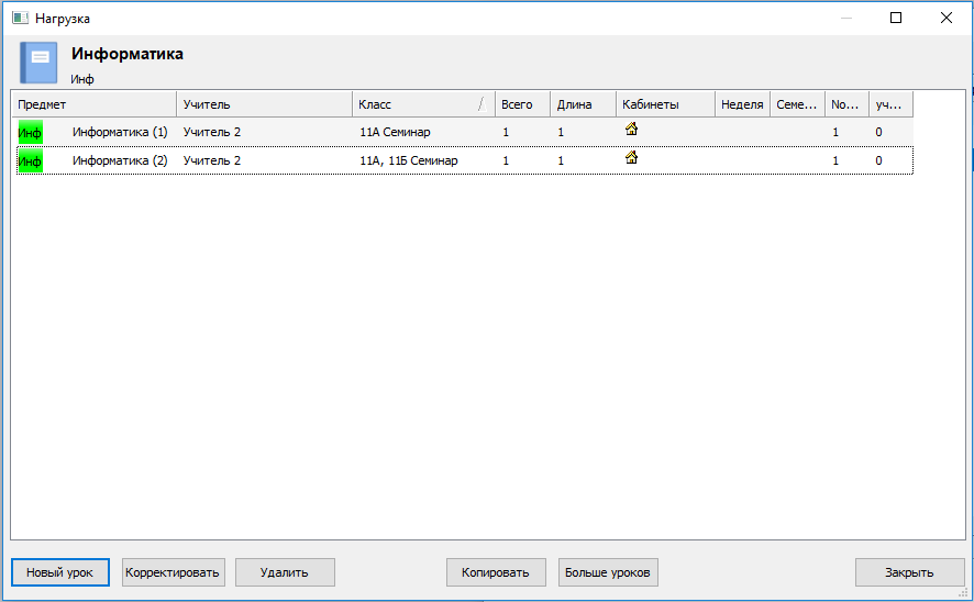 Например, следующая картинка определяет что есть два урока семинара по информатике. Один может посещать ученики из 11A, другой - из 11А/11Б. Потом можно определить, какие именно ученики посещают который урок, или программа их распределит автоматически (в версий Про - во время составления расписания):