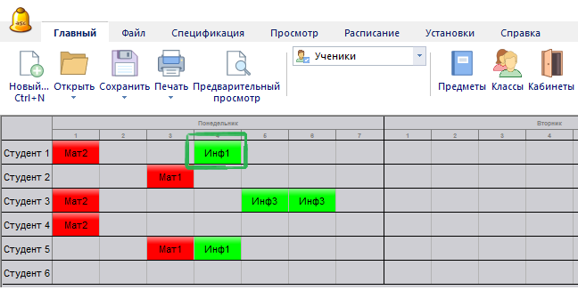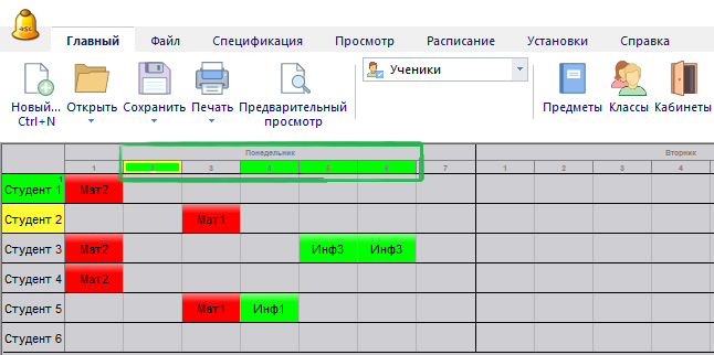 Когда Вы возьмете урок, программа покрасит зеленым цветом возможные позиций, где этот урок может быть помещен.