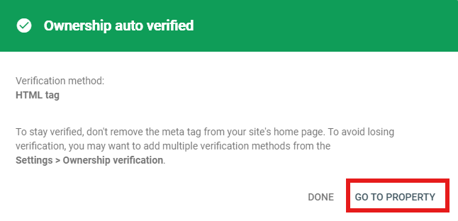 Zobrazí sa potvrdzujúce okno, ktoré hlási, že vlastníctvo bolo automaticky overené. Kliknutím na "Prejsť na vlastníctvo (Go to property)" sa dostaneme do prostredia google konzoly.