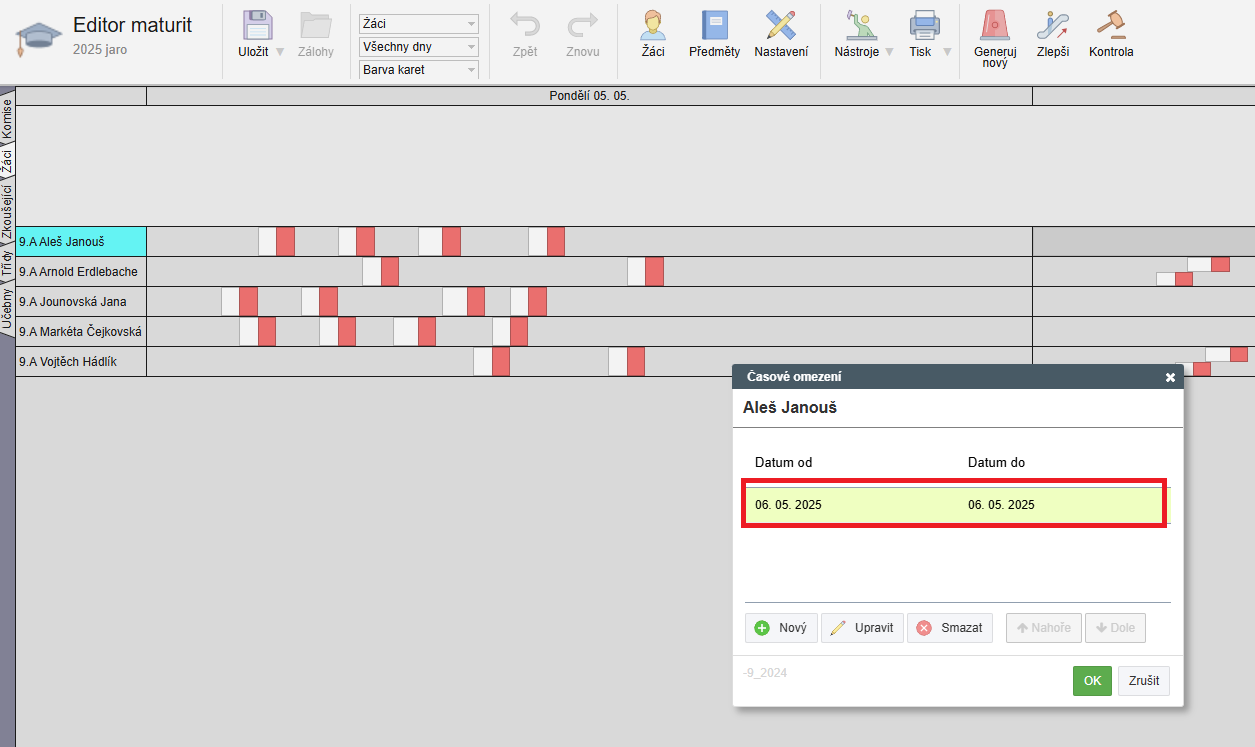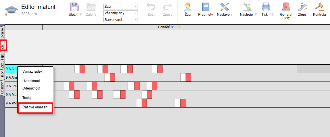 V nastaveniach pre editoru maturít kliknete na položku žiaci a pravým tlačidlom myši kliknete na meno žiaka, kde zvolíte časové obmedzenie: