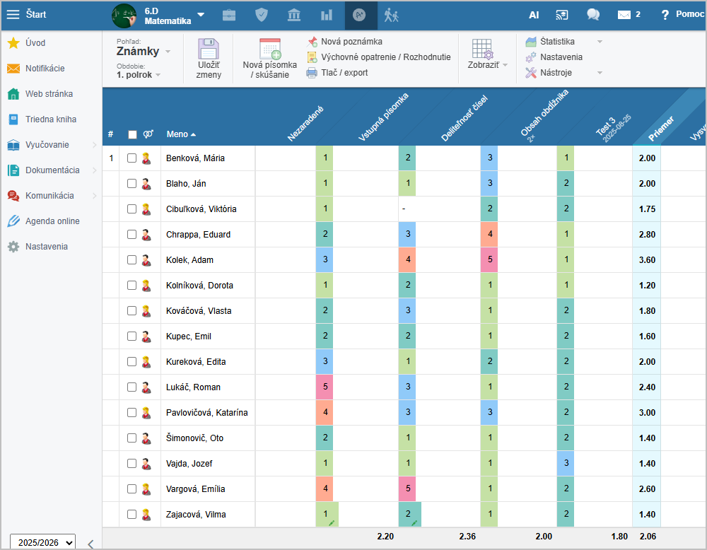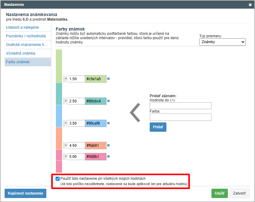 Farby tiež môže nastaviť administrátor centrálne pre celú školu. Pokiaľ má iné farby nastavené administrátor a iné učiteľ, nastavenia učiteľa majú vyššiu prioritu.
