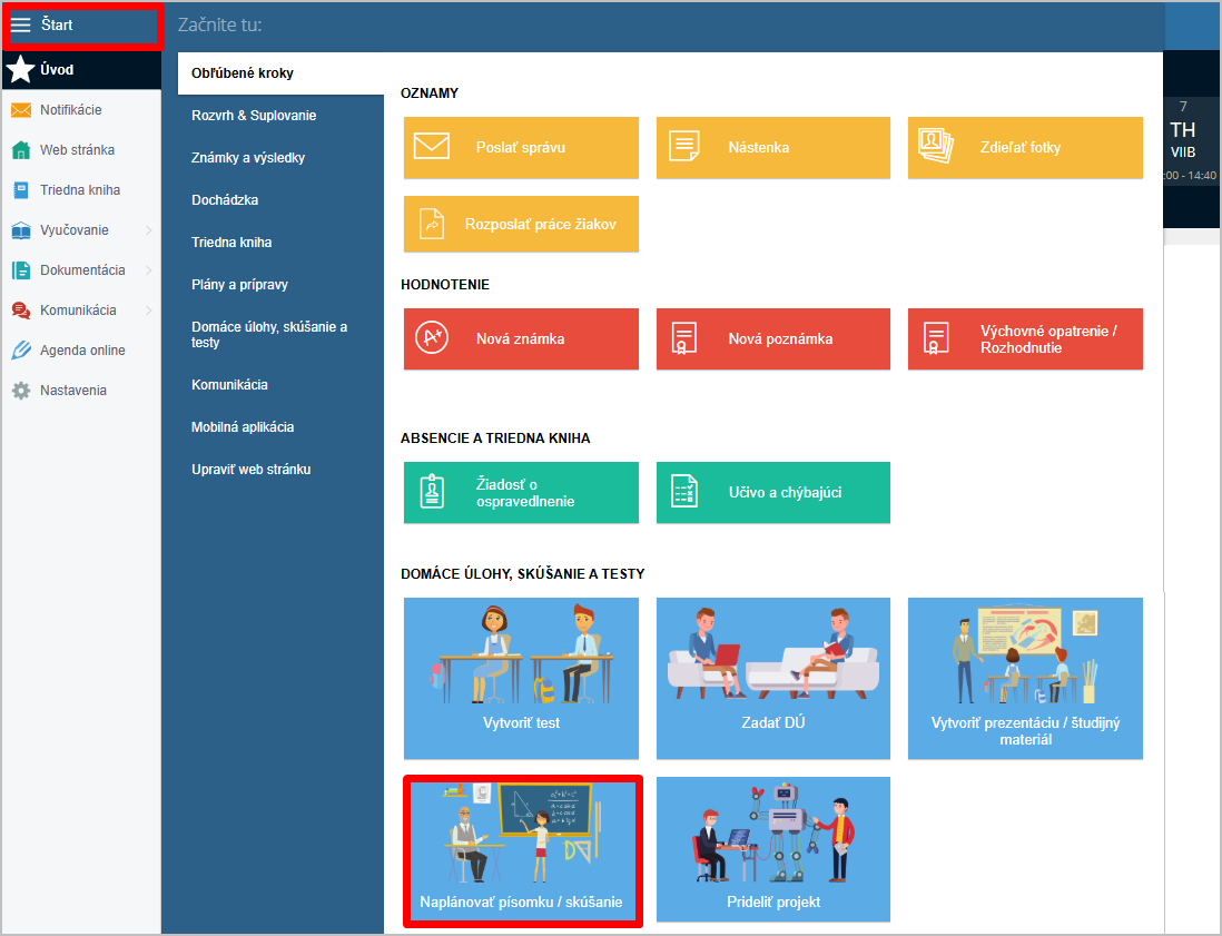 Plánovanie písomiek môže robiť učiteľ cez Štart a Naplánovať písomku/skúšanie.