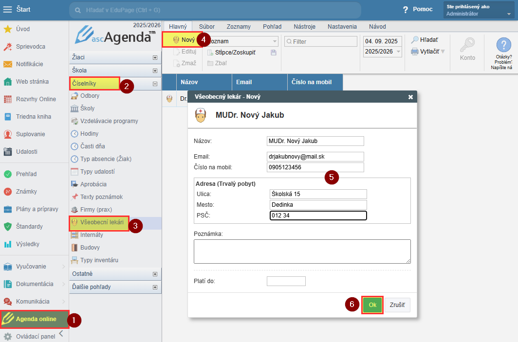 V Agende online (1) v časti Číselníky (2) zvoľte Všeobecní lekári (3). Kliknite na Nový (4) a vypíšte údaje (5) na karte lekára. Nezabudnite zmenu uložiť kliknutím na zelené OK (6).