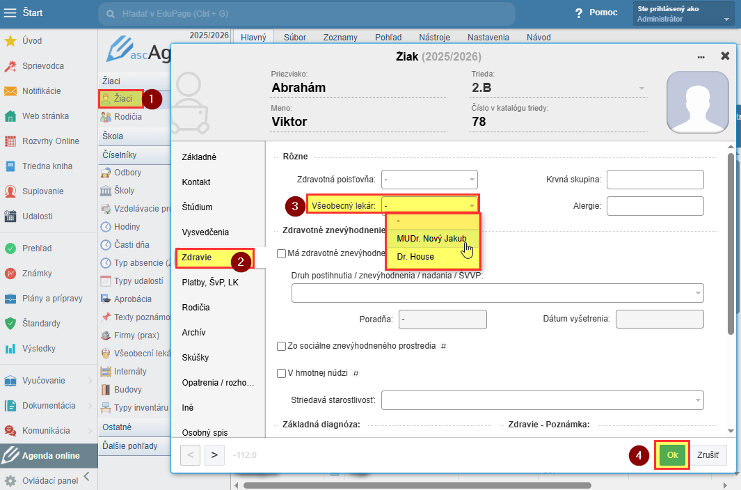 Následne viete takto vytvoreného lekára nastaviť v karte žiaka.
