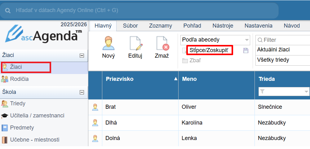 V Agende online je možnosť vytlačiť si aj zoznam telefónnych čísel na rodičov. V pohľade Žiaci klikneme na Stĺpce/Zoskupiť .