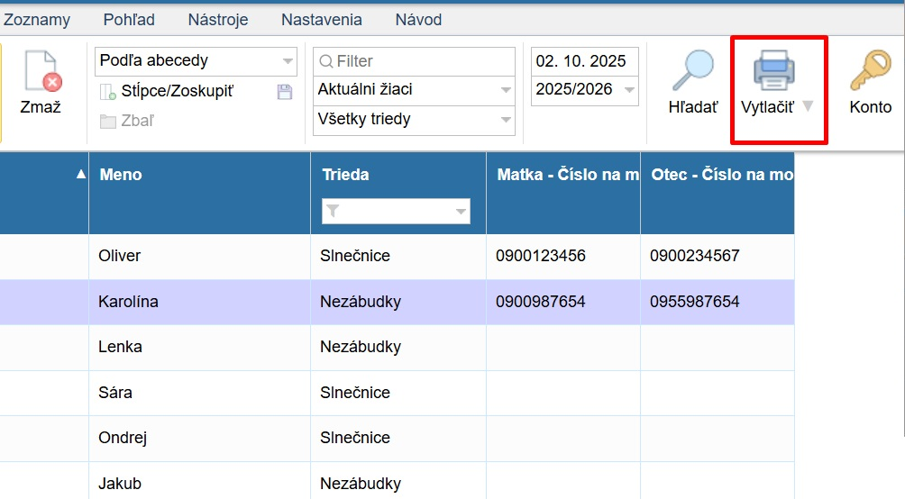 Máme vytvorené stĺpce s telefónnymi číslami rodičov a môžeme si tento zoznam vytlačiť.