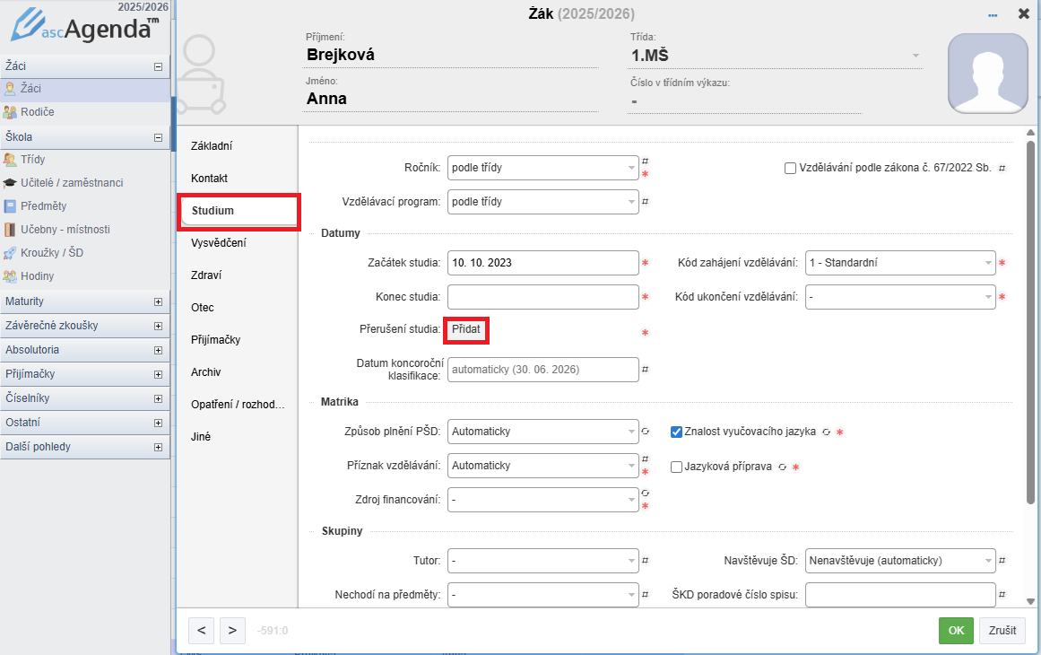Individuální vzdělávání žáka v MŠ podle §34b zadáte přes přerušení studia v Agendě Online v kartě žáka, v záložce „Studium – Přerušení studia – Přidat“:
