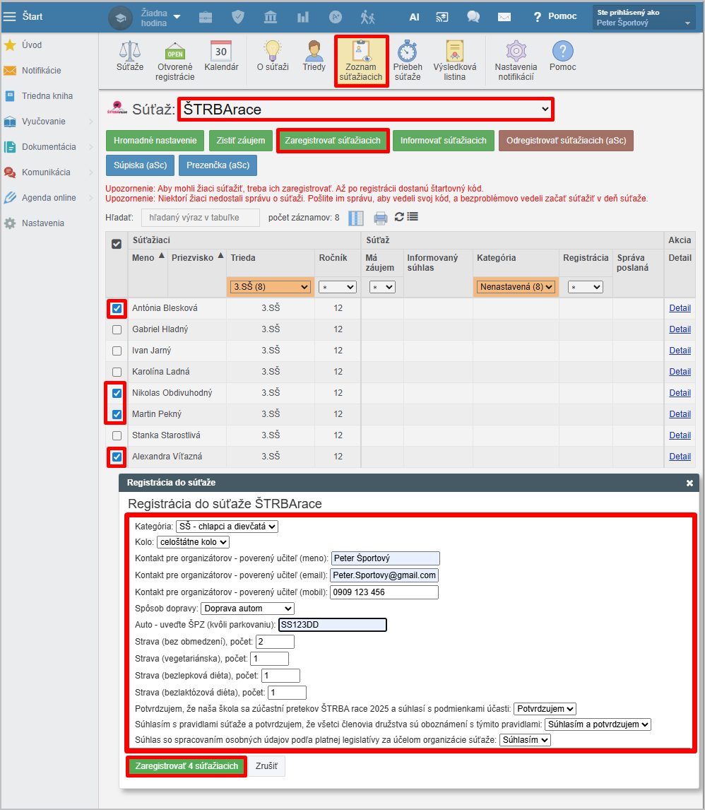 Vyhľadajte žiakov, ktorých chcete zaregistrovať (napr. vyfiltrujte triedu) a označte ich.