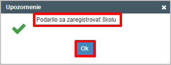 Systém vo vyskakovacom okne potvrdí úspešnú registráciu