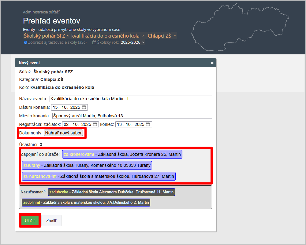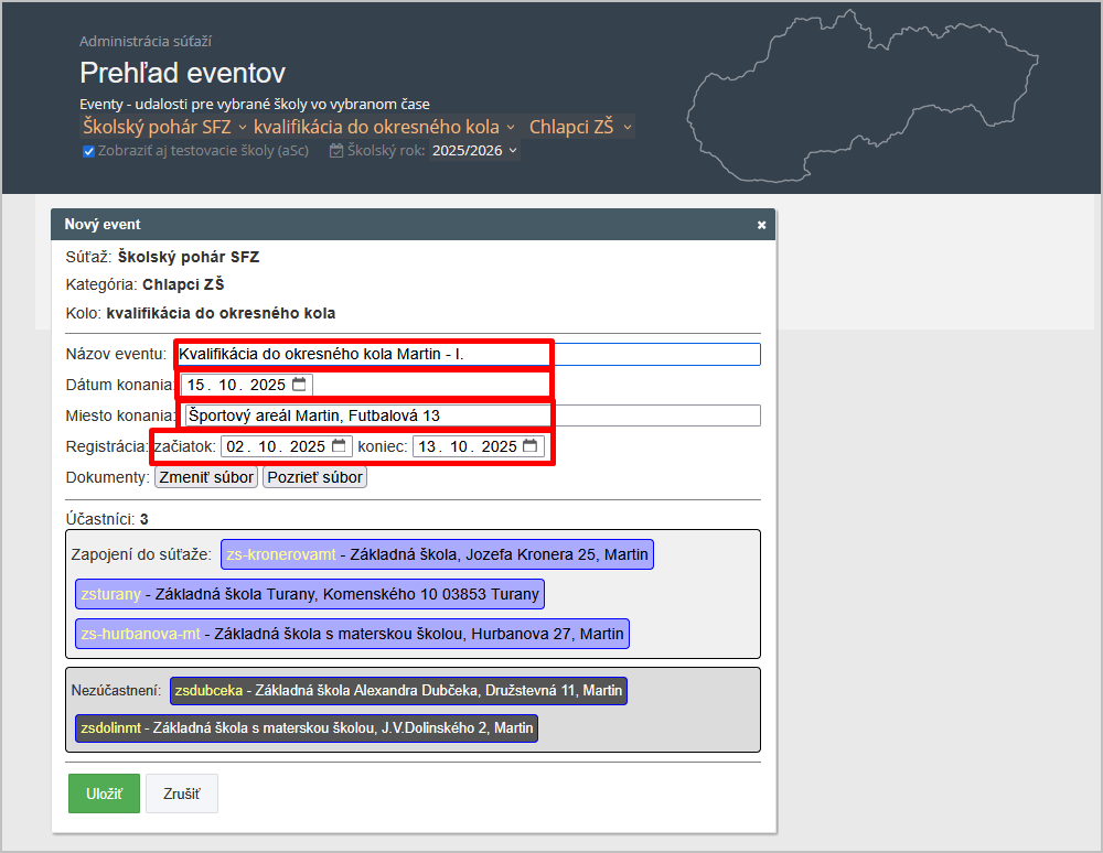 Zo zoznamu prihlásených škôl vyberte tie, ktoré sa budú môcť do daného eventu prihlásiť. Tieto školy zároveň uvidia všetky informácie o udalosti, ktoré do systému zadáte.