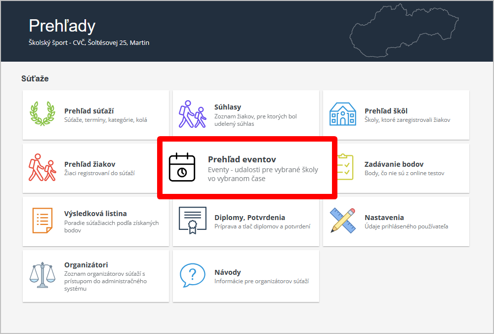V prostredí pre administrátorov/organizátorov súťaží, v čast "Prehľad eventov":
