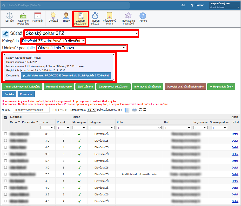 Zaregistrovať žiakov je možné iba v prípade, že organizátor vo vašom okrese/kraji vytvoril konkrétnu športovú udalosť / PODUJATIE Ide o turnaj s presným dátumom a miestom konania, informáciou odkedy dokedy je možná registrácia žiakov do tohto podujatia a sú tam priložené potrebné materiály.