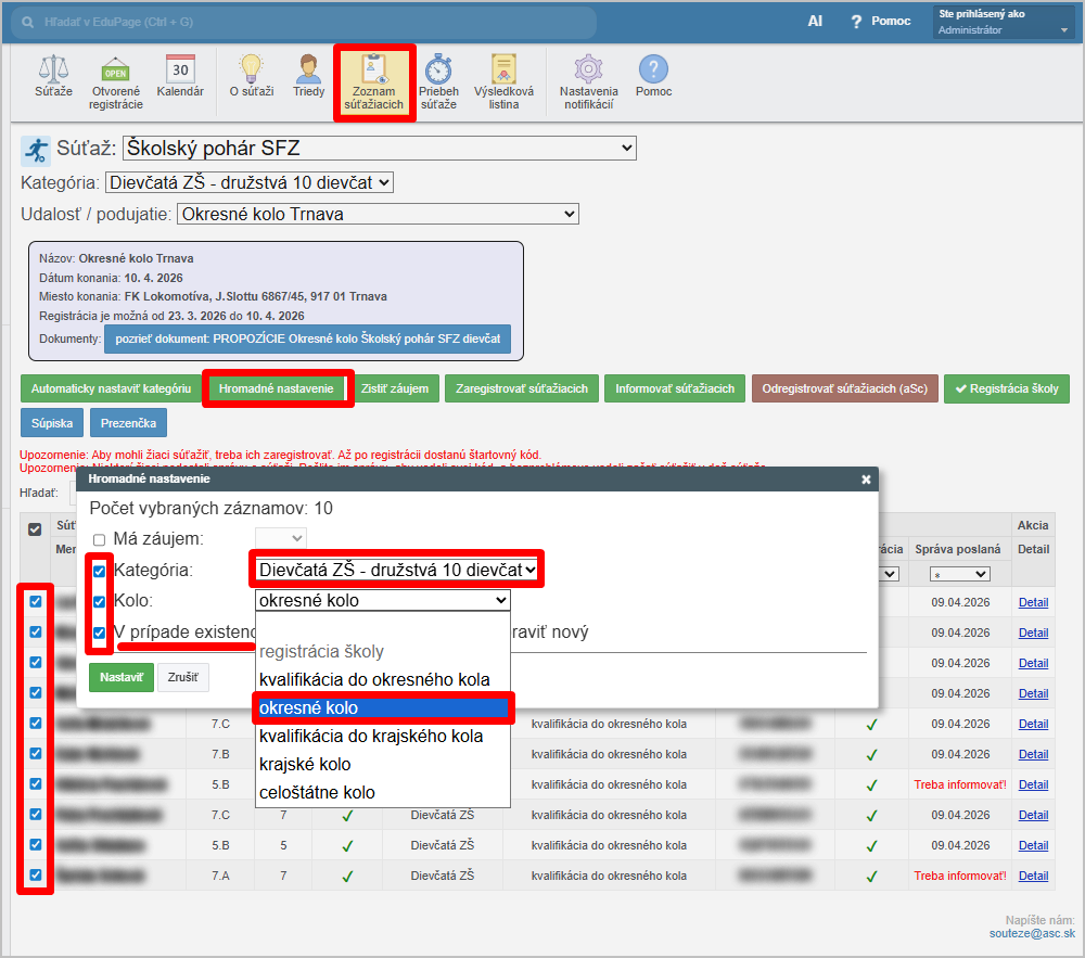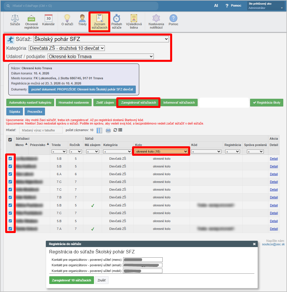 Urobte novú selekciu - teraz si vyberte to ďalšie kolo - napr. okresné. Označte všetkých žiakov, ktorých chcete registrovať do okresného kola a stlačte Zaregistrovať súťažiacich. V novom okne Registrácia do súťaže doplňte, alebo skontrolujte predvyplnené údaje za celú školu súhrnne a potvrďte hromadnú registráciu žiakov:
