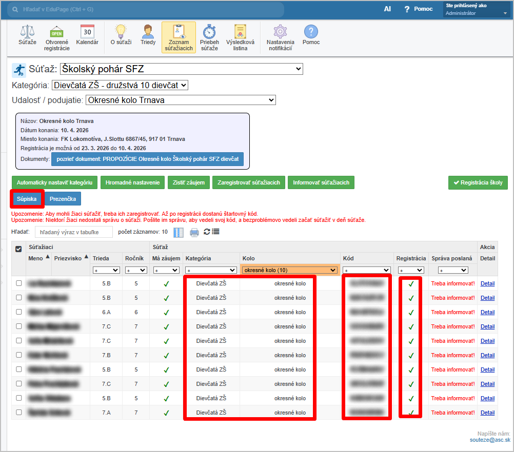 Následne je registrácia žiakov na Ďalšie kolo hotová - žiaci majú pridelený kód a v stĺpci "registrácia" majú zelenú fajku. M"žete rovno stlačiť modré tlačítko "Súpiska" a vytlačiť si ju.