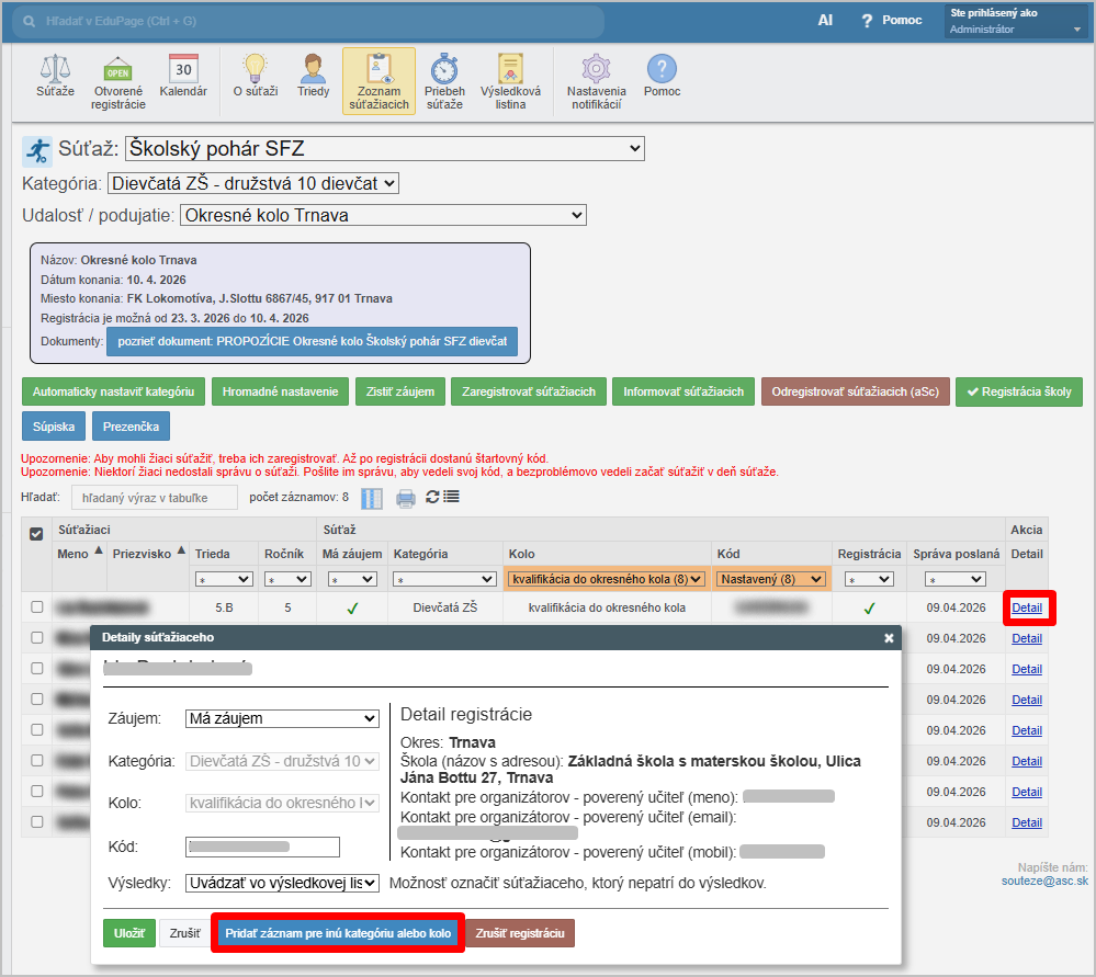 Možné je aj registrovať po jednom žiakovi z rôznych tried. Žiaka bez predchádzajúcej registrácie jednoducho zaregistrujete do správneho kola súťaže stlačením Zaregistrovať súťažiacich. Žiakovi s predchádzajúcou registráciou pridáte nový záznam s novým kolom cez Detail na konci riadku pri mene žiaka: