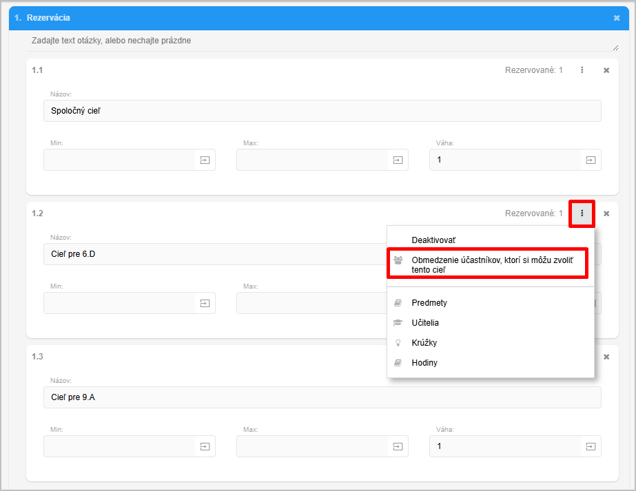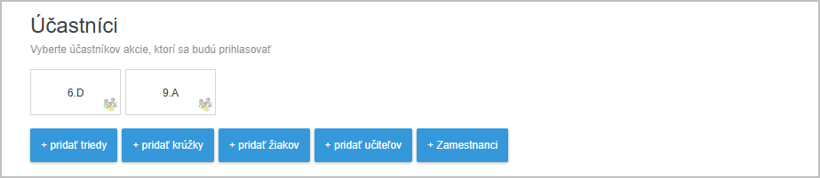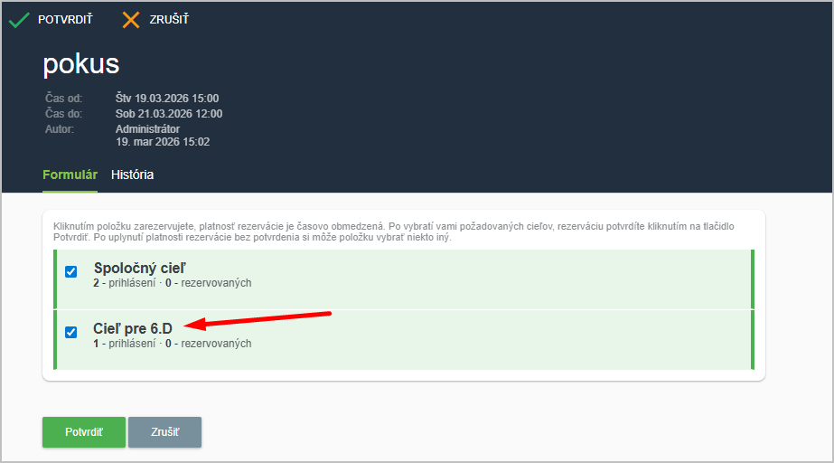 Povedzme že robíme prihlasovaciu akciu pre dve triedy 6.D a 9.A. Jeden cieľ je spoločný a druhý cieľ bude určený iba pre danú triedu.