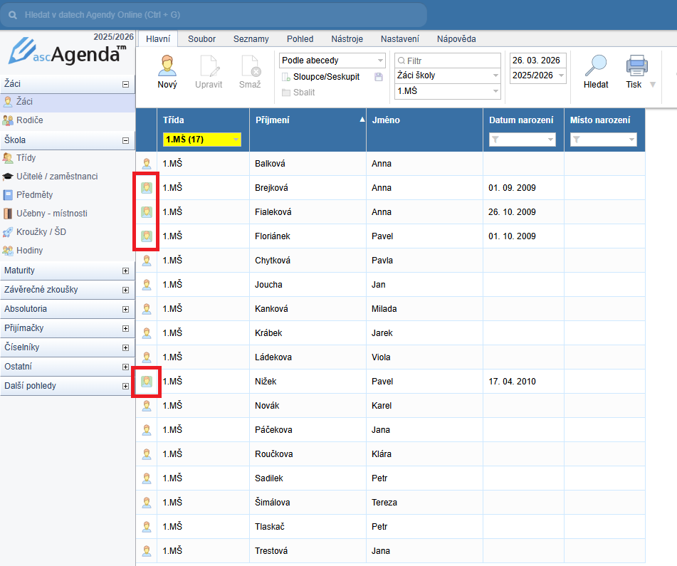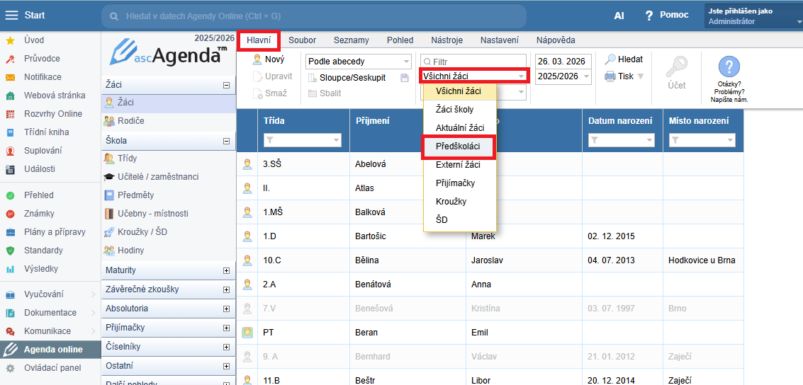 takisto si všetkých predškolákov môžete vyfiltrovať v agende online v menu hlavní - předškoláci: