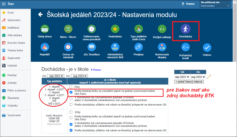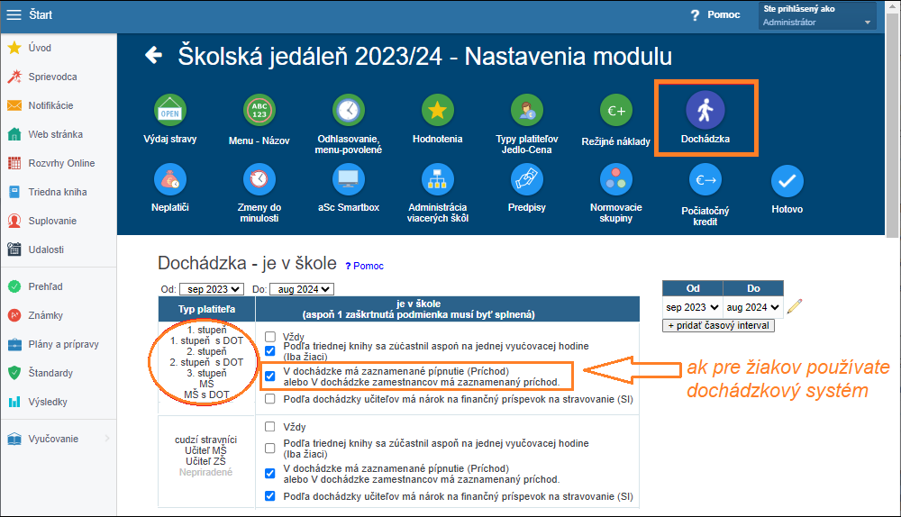 Ak používate aj / iba dochádzkový systém, v nastaveniach modulu jedáleň - v kroku 'Dochádzka' pre žiakov zakliknite aj tretiu možnosť