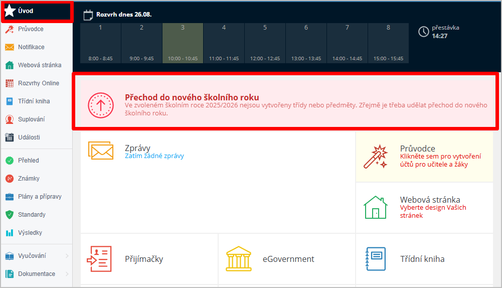 Nebo od začátku srpna na hlavní stránce uvidíte výzvu k přechodu do nového školního roku, klikněte na ni: