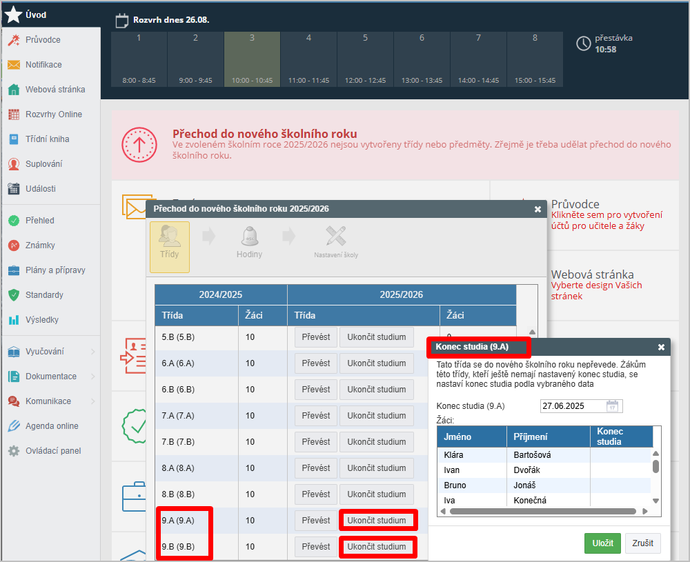 V novém okně se zobrazí seznam všech vašich tříd z minulého školního roku. Pro každou třídu zvlášť vyberte, zda přechází do nového školního roku, nebo zda tato třída byla v posledním ročníku a tedy celá třída ukončila studium na vaší škole.