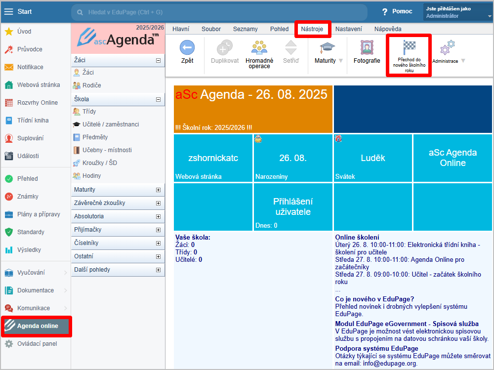 V levém menu vyberte modul Agenda Online a v něm Nástroje / Přechod do nového šk. roku: