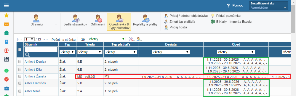 V časti 'Stravníci' -> 'Objednávky & Typy platiteľov' použite tlačidlo v hornom menu 'Pridaj / odober objednávku'.