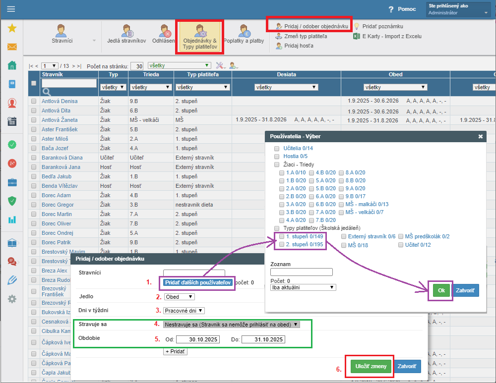 1. 'Stravníci' - cez modré tlačidlo 'Pridať ďalších používateľov' - vyberiete potrebných stravníkov