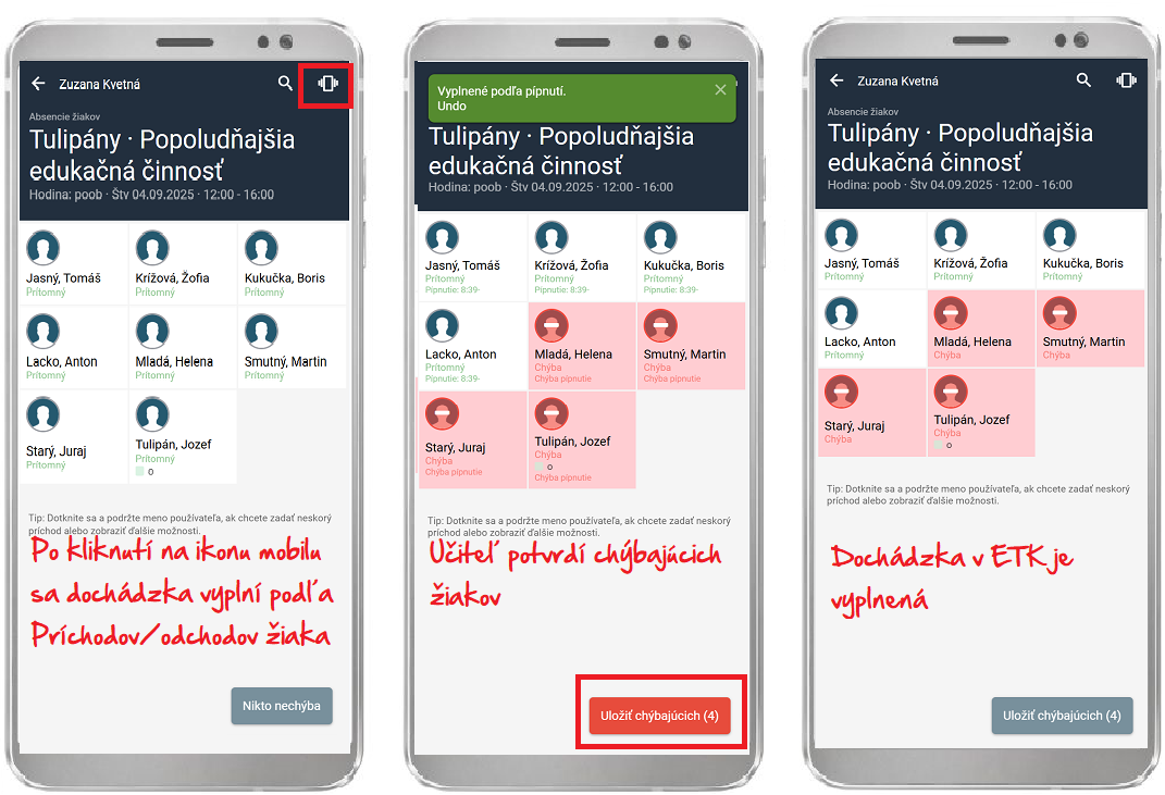 2. Učiteľ zadá dochádzku - chýbajúcich žiakov