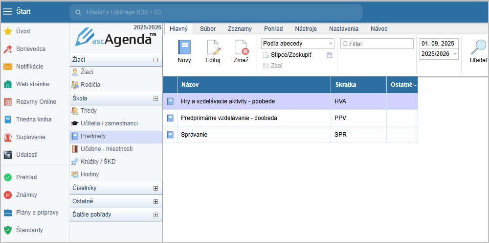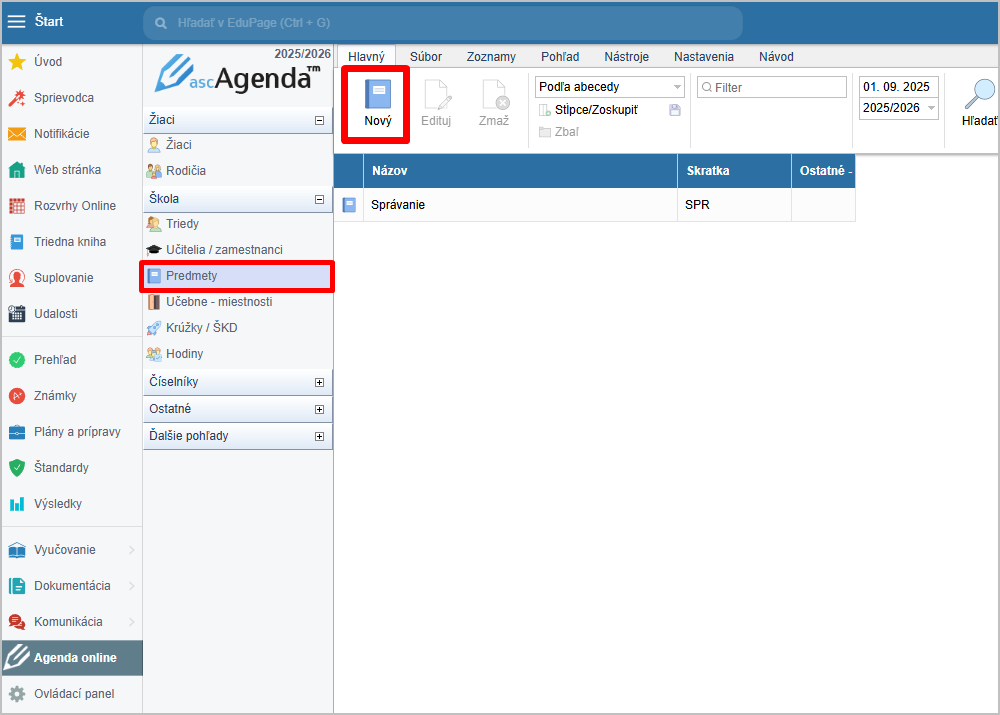 Nový predmet sa pridáva stlačením tlačidla Nový.